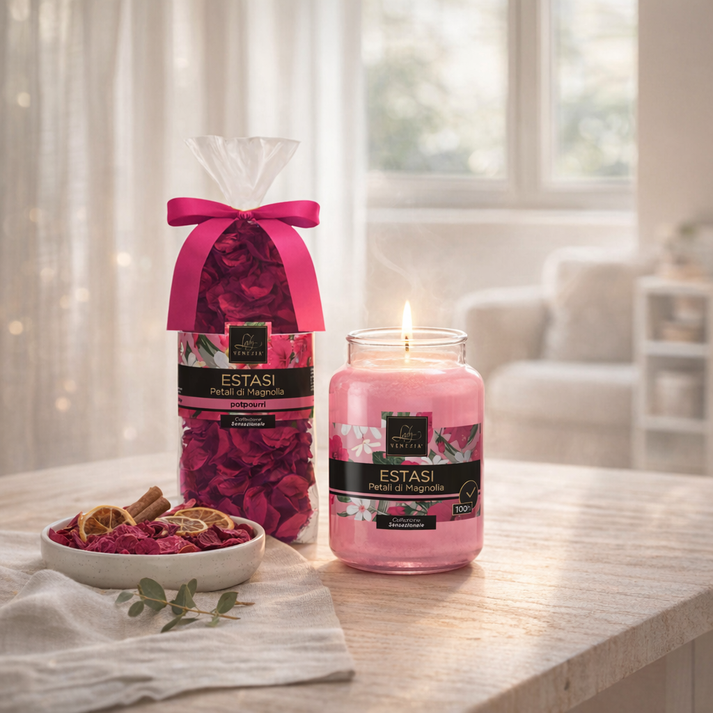 Scopri le candele profumate in vetro e i potpourri Lady Venezia: fragranze avvolgenti e design essenziale per creare un’atmosfera calda e accogliente in ogni ambiente. Le candele donano luce e profumo, mentre i potpourri aggiungono un tocco decorativo naturale e raffinato. Perfetti anche come idea regalo, trasformano la casa in un’esperienza sensoriale elegante.